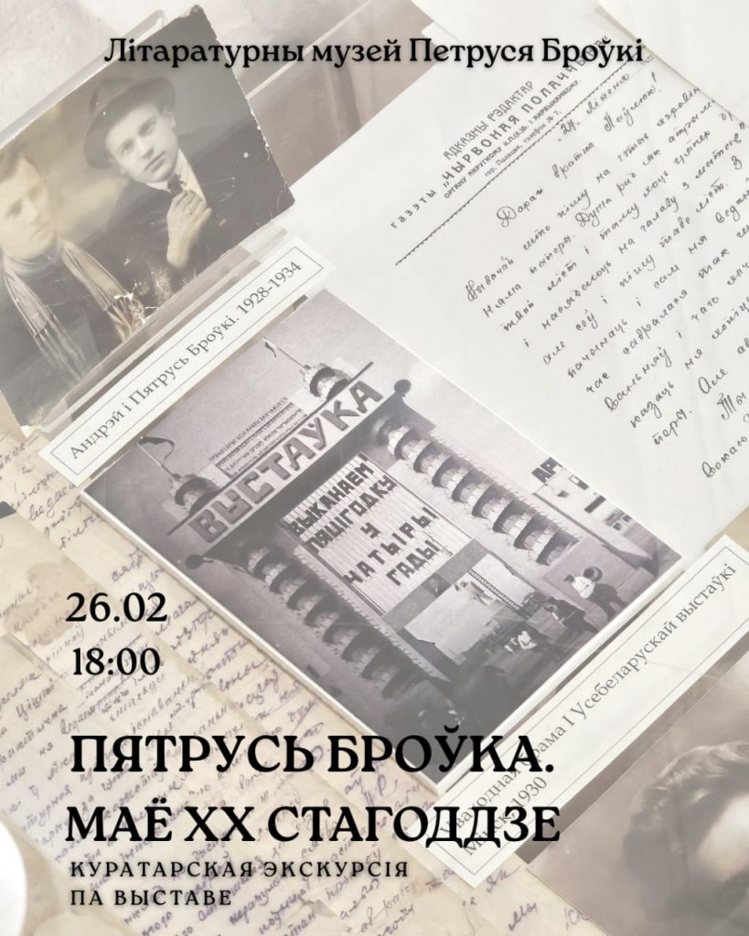 26 лютага а 18-й гадзіне ў Літаратурным музеі Петруся Броўкі пройдзе куратарская экскурсія ад Карыны Кушчанкі па часовай экспазіцыі “Пятрусь Броўка. Маё ХХ стагоддзе”.