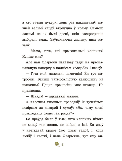 “Лапікавы хлопчык з кветкавай крамы “Фларыян і Ружа” марыць, каб з ім, як і з іншымі цацкамі, гулялі дзеці. Ды дзеці бываюць тут рэдка, пані Ружы больш няма, а пан Фларыян увесь час сумуе, і нават набліжэнне Калядаў не паляпшае яму настрой.